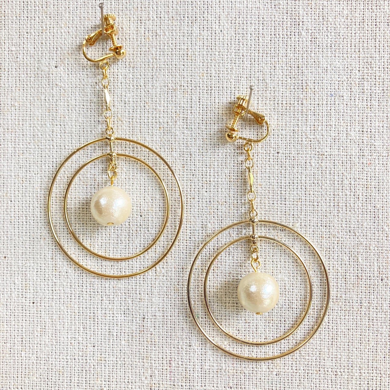 耳元が二重リングとコットンパールで華やかに揺れます。 素材・サイズ・。・。・。・。・。・ ・コットンパール12mm(綿を圧縮して作られたフェイクパール) ・二重リング 直径約45mm ・チェーン、金具部分 約20mm ・ネジバネイヤリング