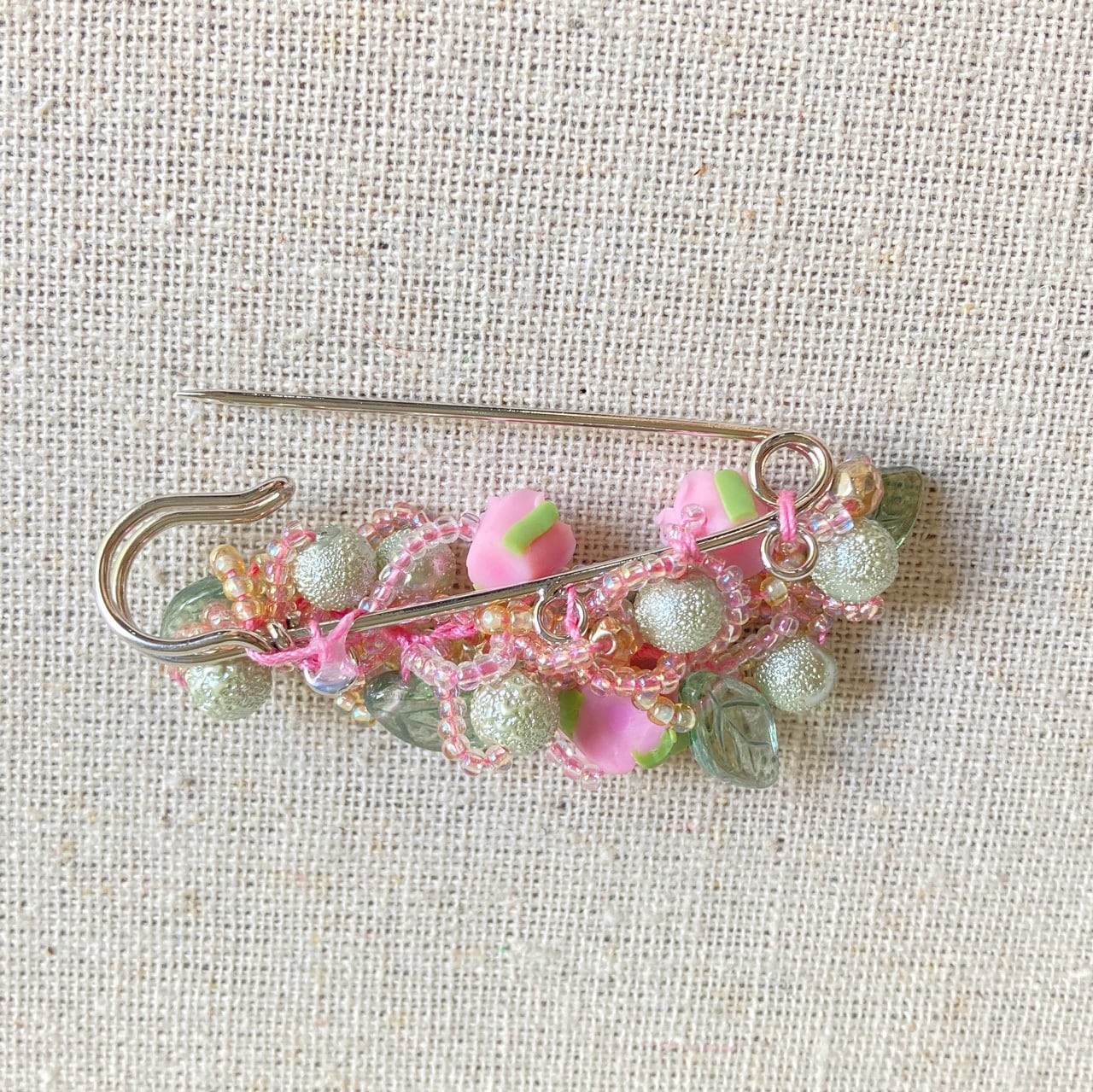 粘土で作った薔薇とビーズをレース糸に 通して編み、ブローチの金具に止めつけ ています。 参考に帽子やかごバックにつけてみました。 素材・。・。・。・。・。 フィモローズ チェコビーズ 丸小ビーズ カラーパール レース糸 サイズ・。・。・。・。・。 カブトピン 55mm シルバーカラー 注意事項・。・。・。・。・。 薔薇は粘土で作られていますので、 取り扱いにご注意ください。